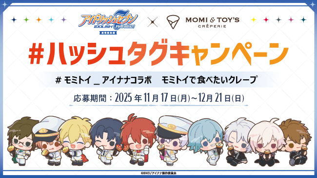 X にてMOMI&TOY'S公式アカウントをフォローのうえ、ハッシュタグ『#モミトイ_アイナナコラボ』と